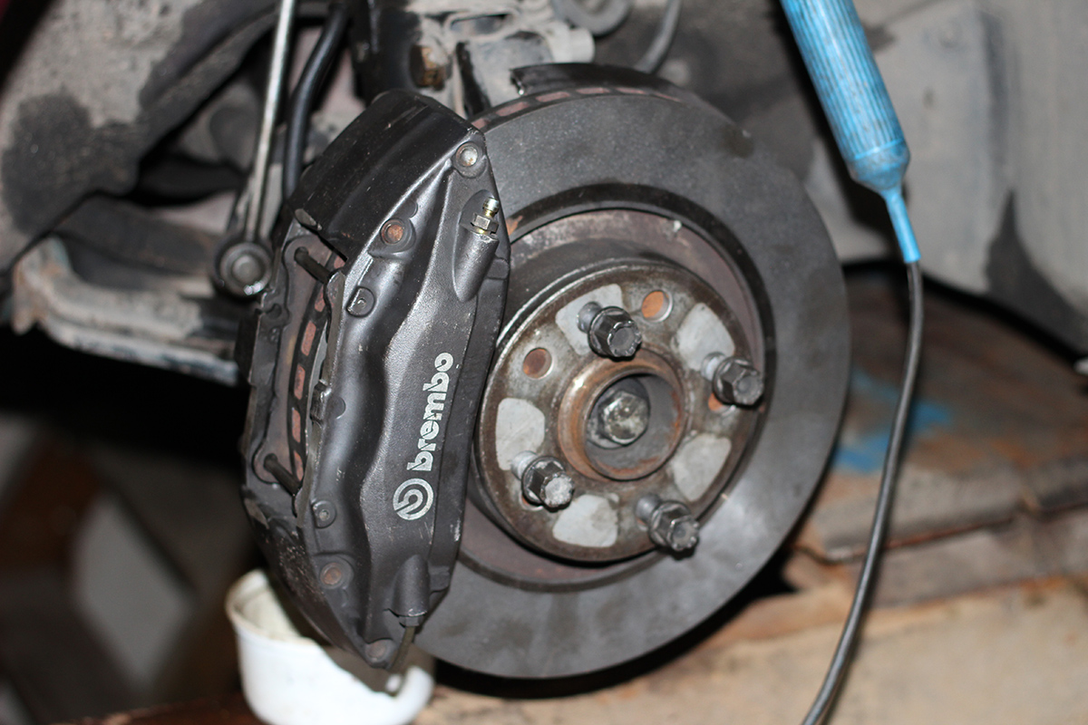 Pagaliau jie uždėti ant automobilio :) Suportai šiek tiek nufrezuoti, kad užsidėtų ant Cupelio. Stabdžių diskai nuo Audi A8, sumažintas jų diametras, perdarytas skylių skaičius į 4 po 108mm. Senieji stabdžiai, kurie eina į 2.3, 2.0 16V ir pan.