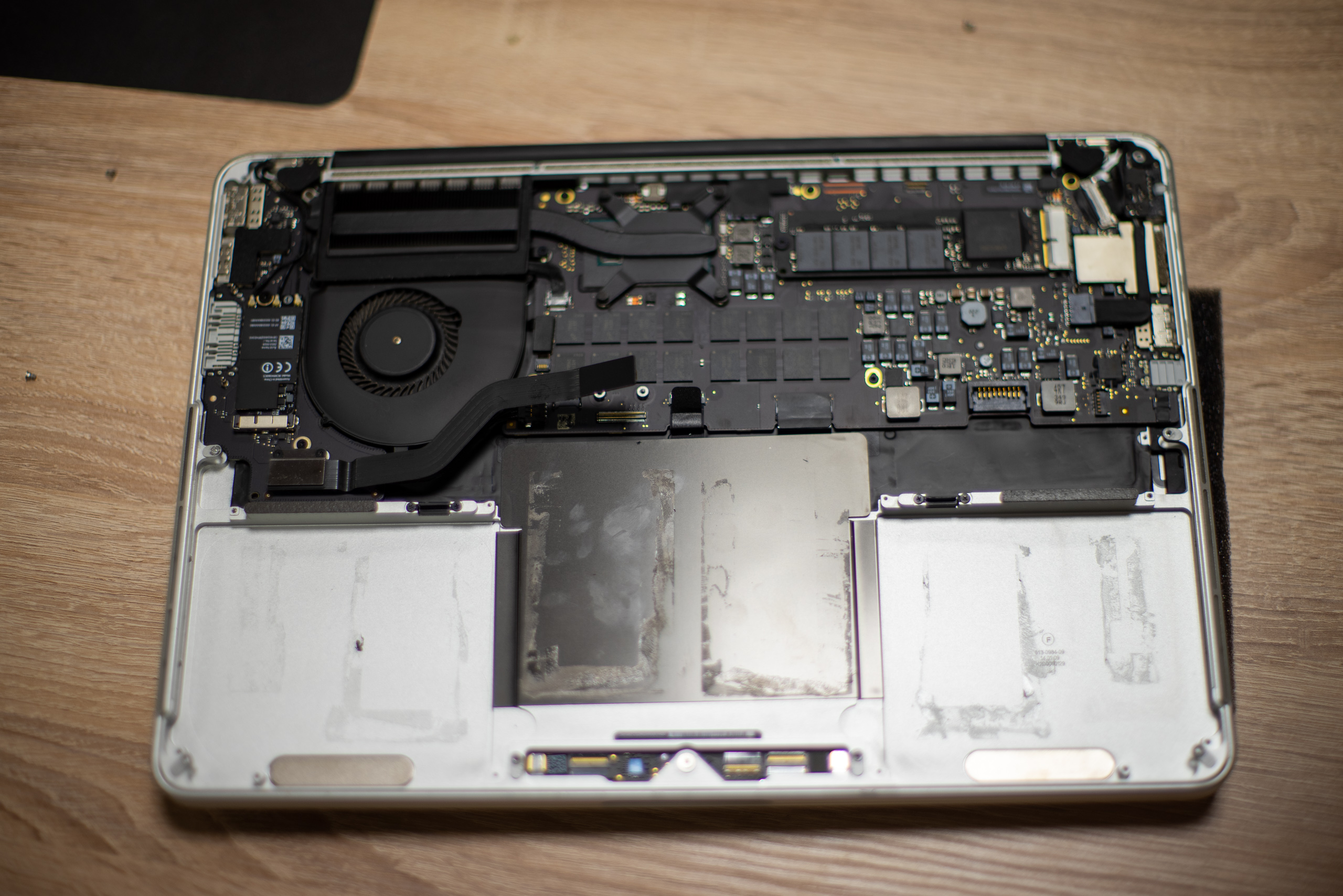 One day I placed my Macbook (Macbook Pro Late 2013) on a desk and noticed that it doesn't sit right. The front feet were in the air. The swollen battery deformed the bottom of the laptop.